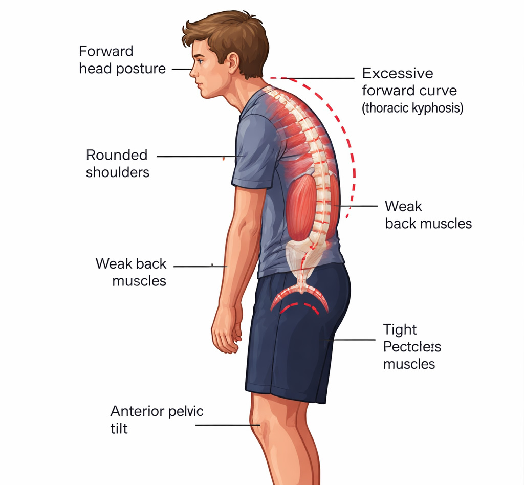 Sepehri et al. (2024) conducted a systematic review and meta-analysis including individuals with forward head posture, rounded shoulders, and hyperkyphosis—features strongly associated with postural kyphosis. Therapeutic exercises significantly reduced thoracic kyphosis angle and improved upper-quarter alignment, supporting exercise-based rehabilitation as a primary intervention (3).